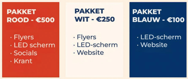 Vermelding van naam/logo op onze website en sociale mediakanalen, LED scherm, flyers én krant.